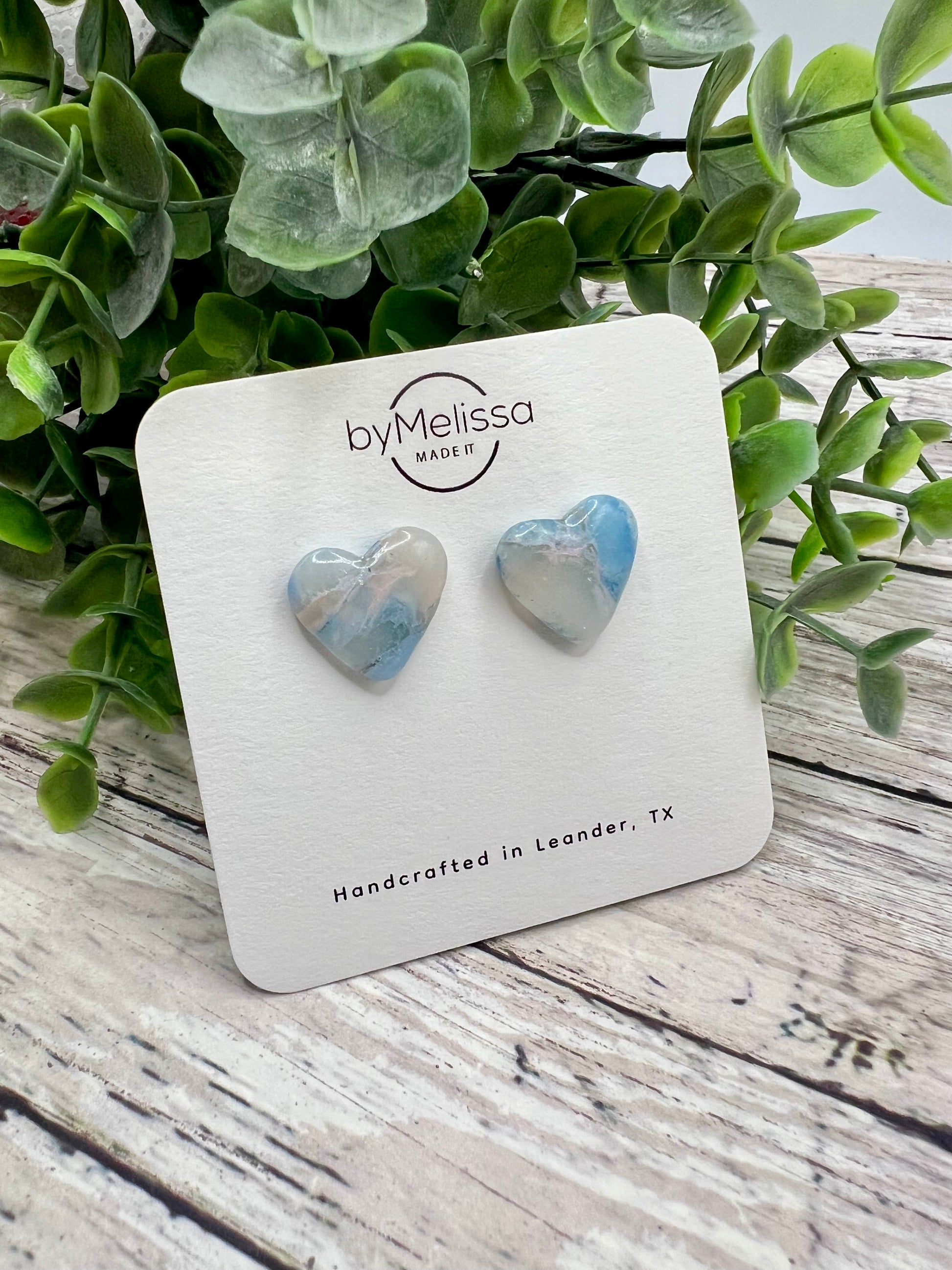 Elevate your everyday look with our lightweight Blue and Light Pink Heart Stud Earrings. Made with polymer clay to resemble stone, these earrings are not only stylish but also hypoallergenic and tarnish resistant. Perfect for those with sensitive ears.
