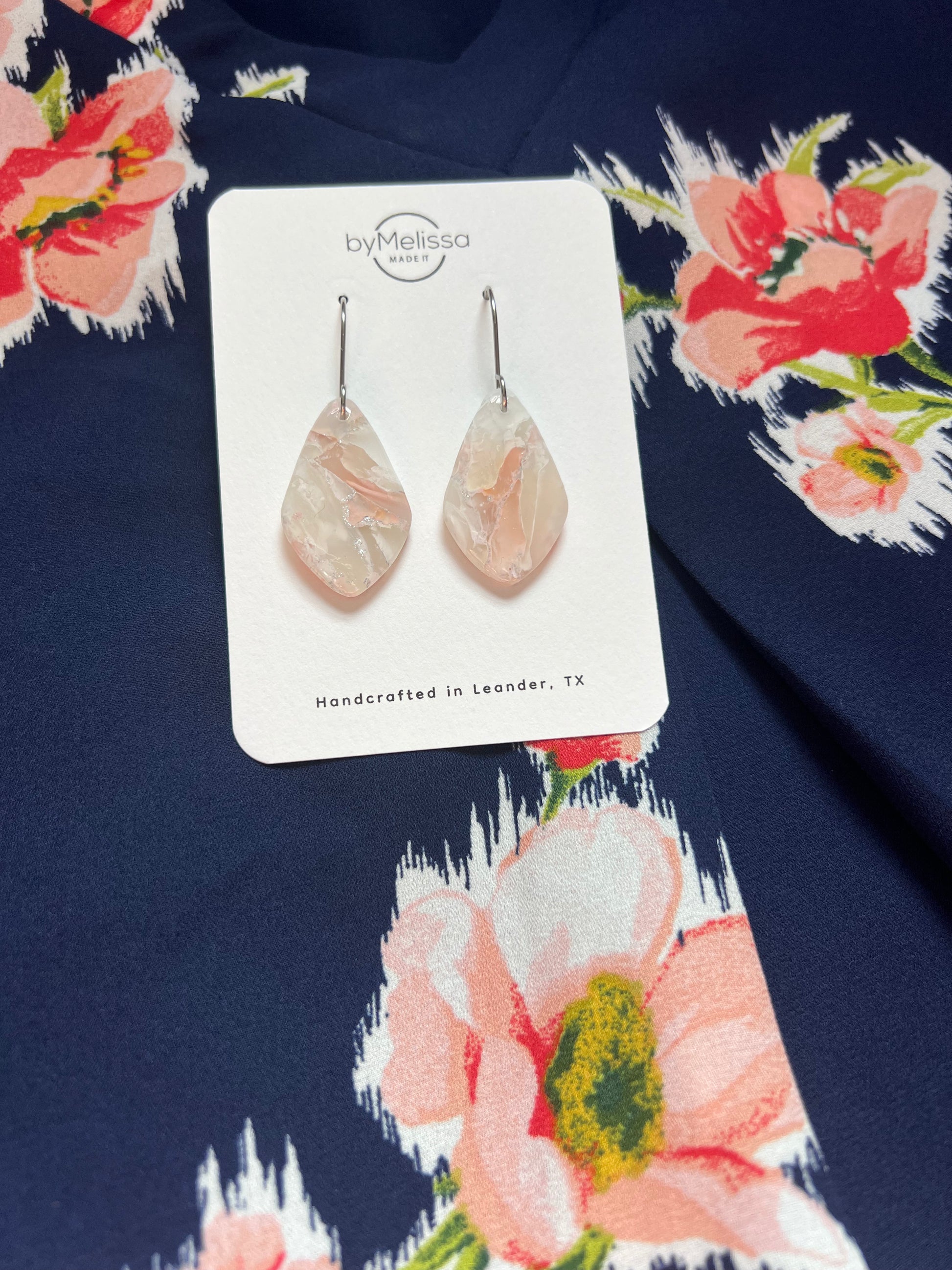 Pretty in pink (with a twist)! These Blush Pink and White Small Kite Drop Earrings bring soft elegance with their delicate marble design and clean, geometric shape. Each pair is handcrafted from lightweight polymer clay for a stylish faux stone look you can wear all day. Finished with hypoallergenic, tarnish resistant silver stainless steel hooks, they’re perfect for everything from coffee dates to wedding jewelry for the minimalist bride.
