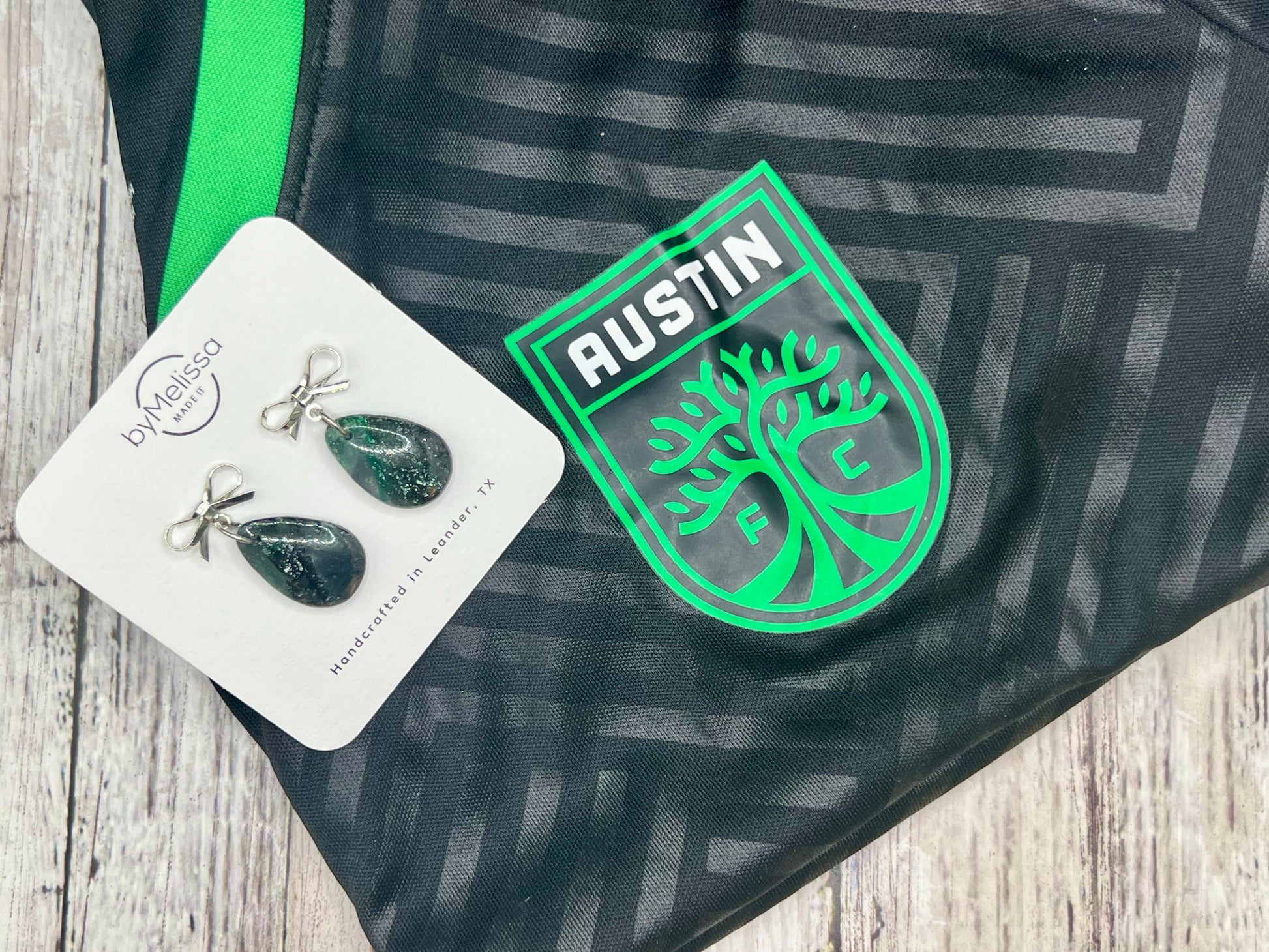 Elevate your game day look with these Forest Green and Black Bowknot Teardrop Earrings—where sporty meets stylish. Handcrafted from polymer clay, each pair features a unique marble design that mimics the look of faux stone, giving them a high-end finish without the weight.