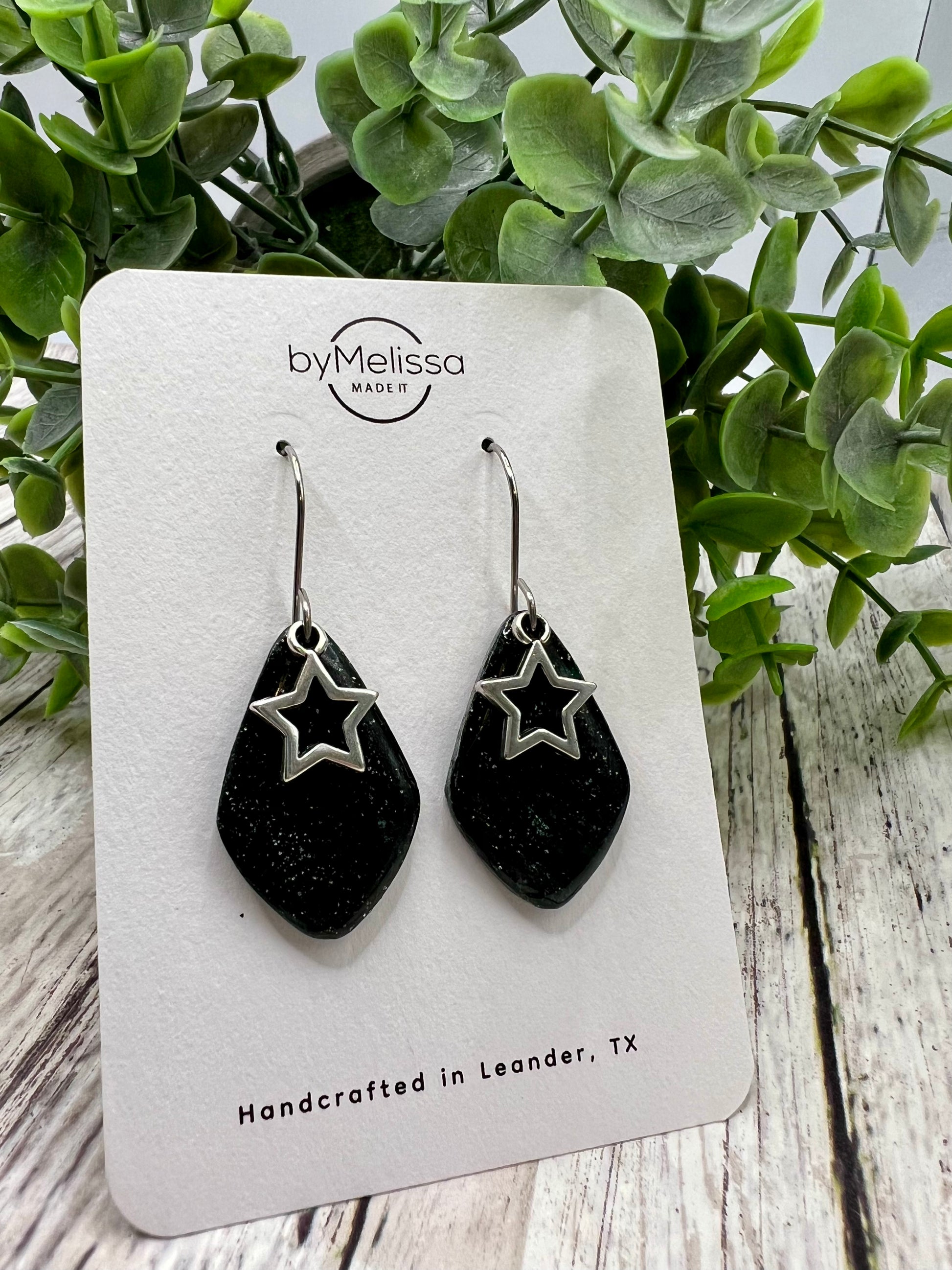Forest Green and Black Small Kite Drop Earrings in Silver with Star Charm