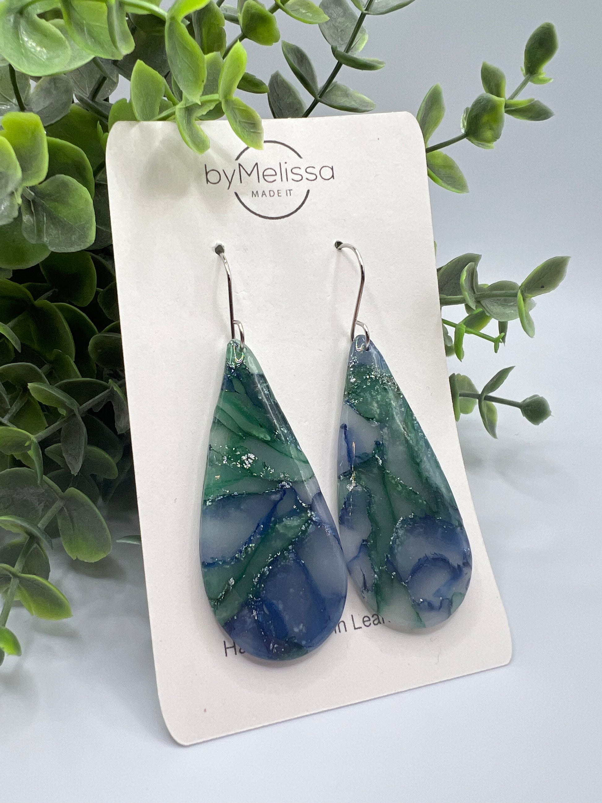 Forest Green and Blue Large Teardrop Drop Earrings in Silver