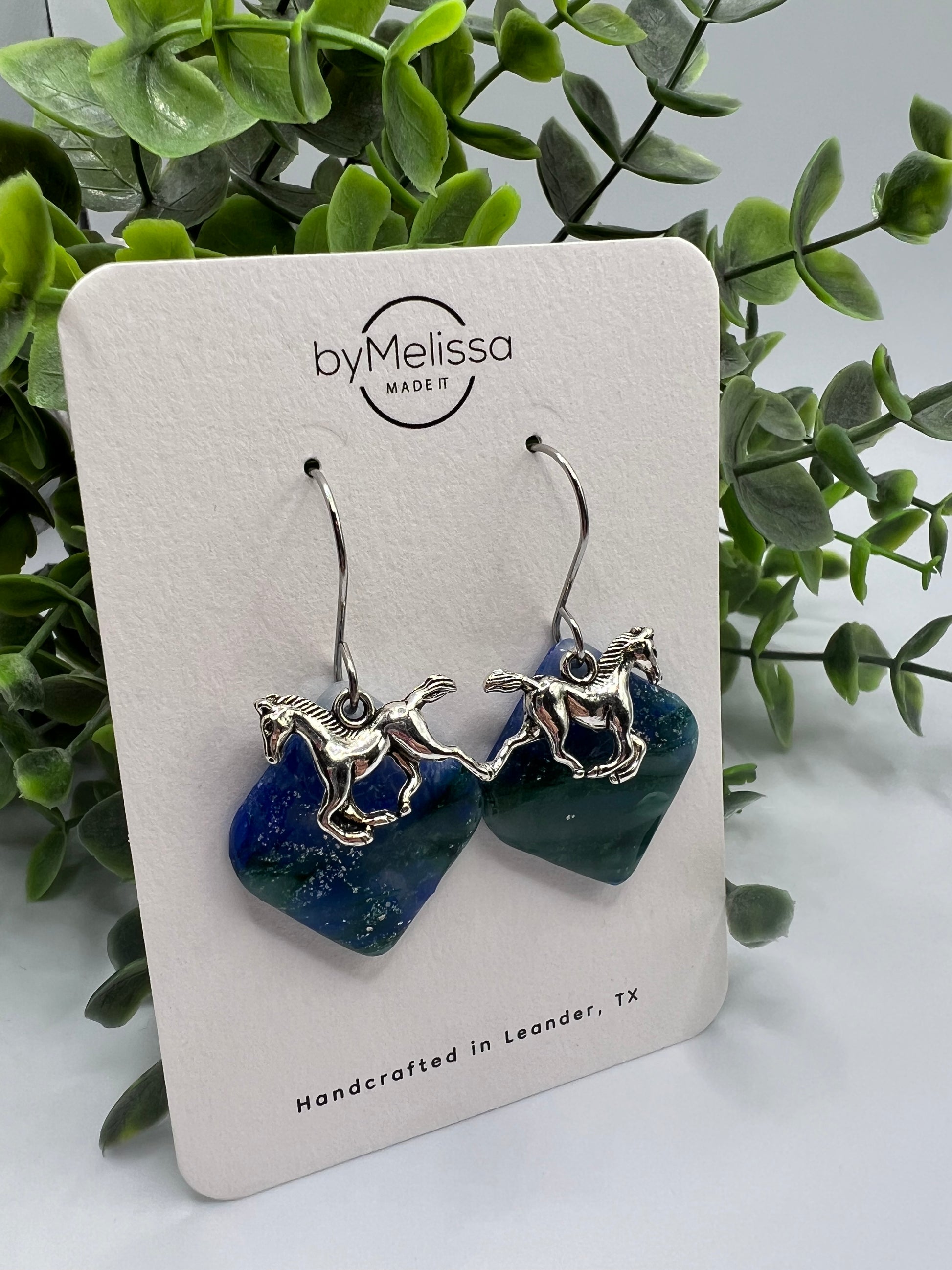 Forest Green and Blue Small Rounded Square Drop Earrings in Silver with Horse Charm