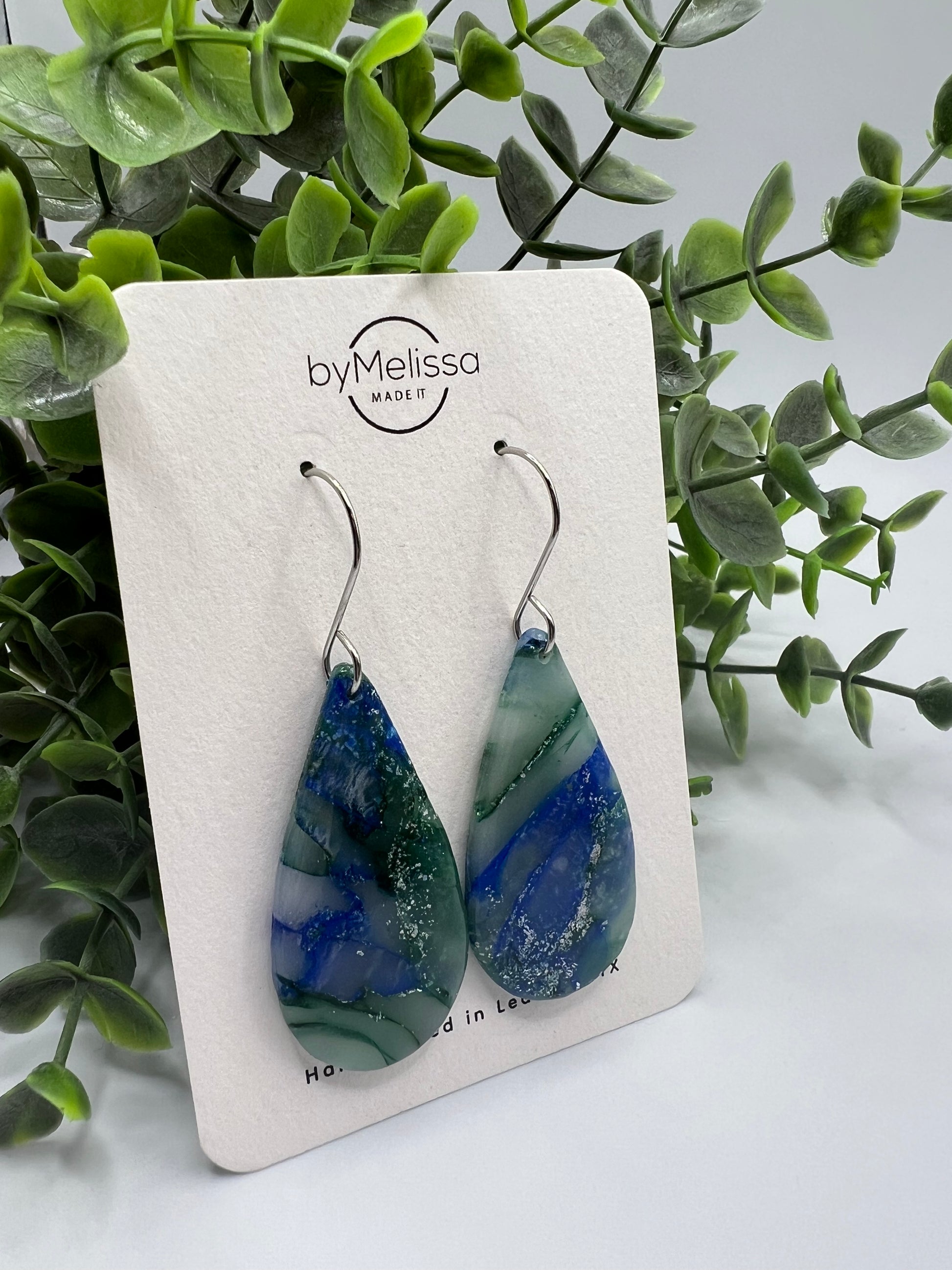 Elevate your game day look with our exquisite Forest Green and Blue Small Teardrop Drop Earrings in Silver. Lovingly handcrafted, these earrings showcase blue and green polymer clay with glimmering silver flakes for a one-of-a-kind touch. Embody your team's spirit and add a hint of refinement to any outfit.