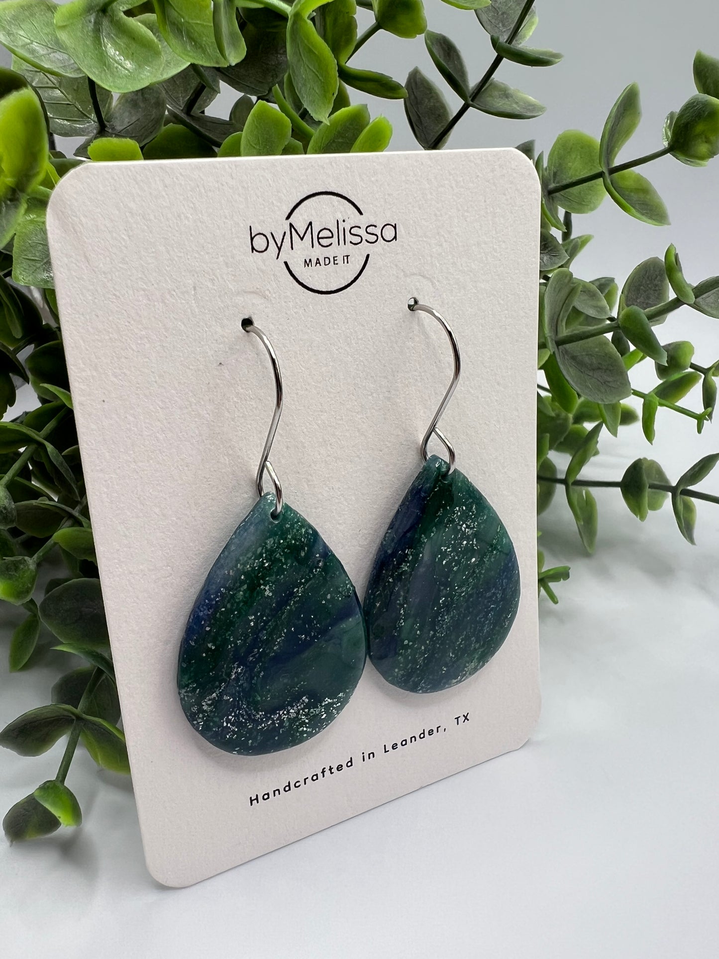 Forest Green and Blue Small Wide Teardrop Drop Earrings in Silver