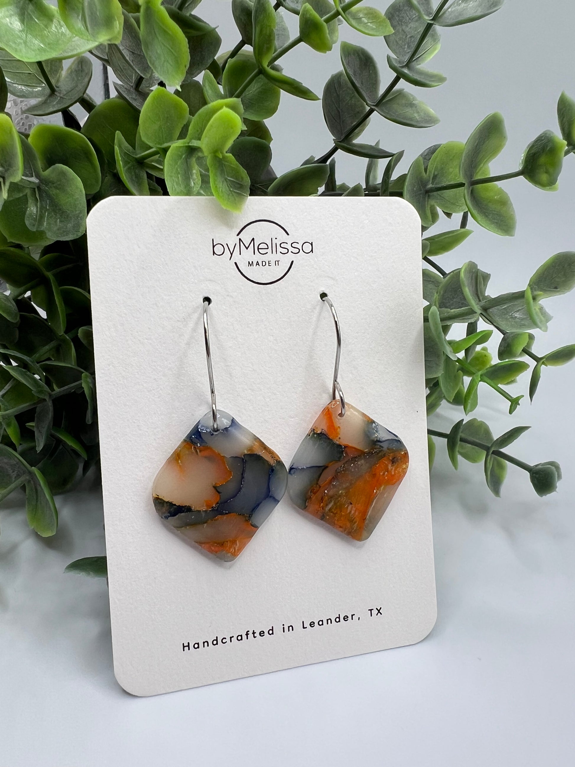 Navy and Orange Small Rounded Square Drop Earrings in Silver
