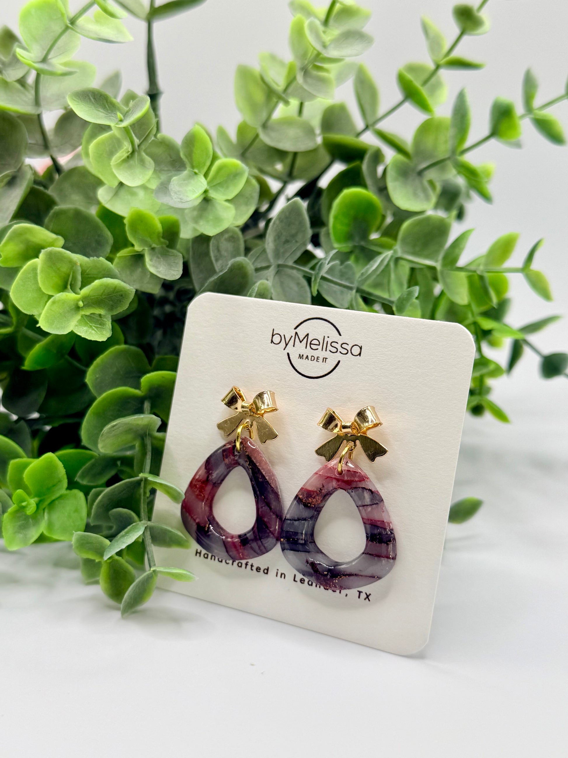 These maroon and black open triangle earrings feature a sleek geometric design accented with petite gold bows for a chic, feminine finish. Handcrafted from polymer clay, they’re lightweight and comfortable for all-day wear. Finished with hypoallergenic stainless steel hardware, they’re safe for sensitive ears and add a bold, stylish touch to any outfit.