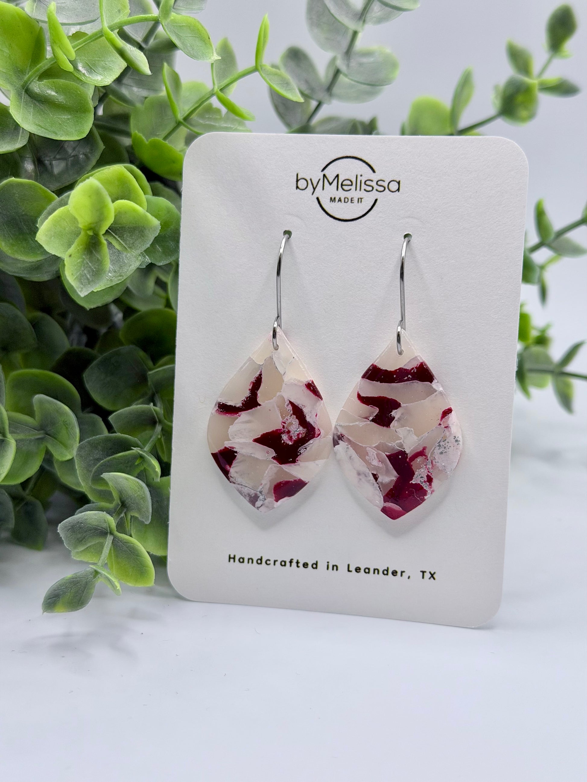 Handcrafted from polymer clay, these wide leaf earrings feature a maroon and white marbled pattern created with a faux stone technique. Each pair is individually made, giving every swirl a distinct, artisan look. Finished with hypoallergenic stainless steel hooks in silver that resist tarnish, these lightweight earrings offer a perfect blend of elegance and team spirit.