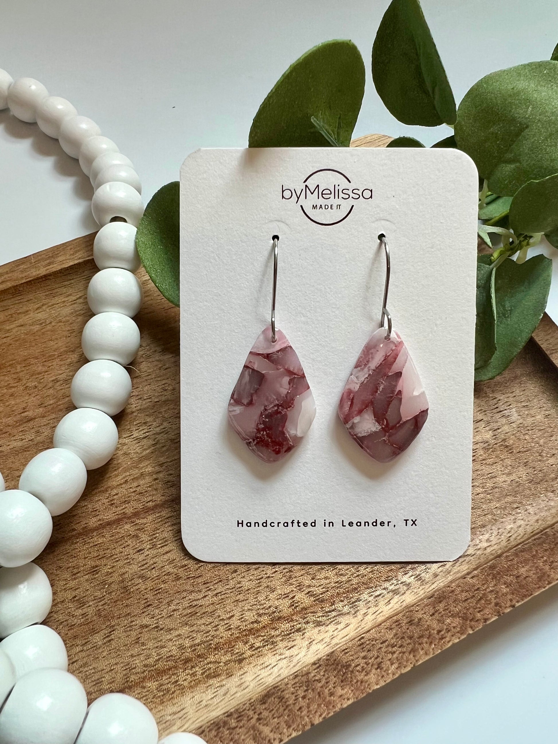 Introducing our Maroon, Pink, and White Small Kite Drop Earrings in Silver! These lightweight earrings feature a stunning marble design made of polymer clay that gives off a sophisticated, stone-like appearance. Elevate your everyday look with these elegant and exclusive earrings.