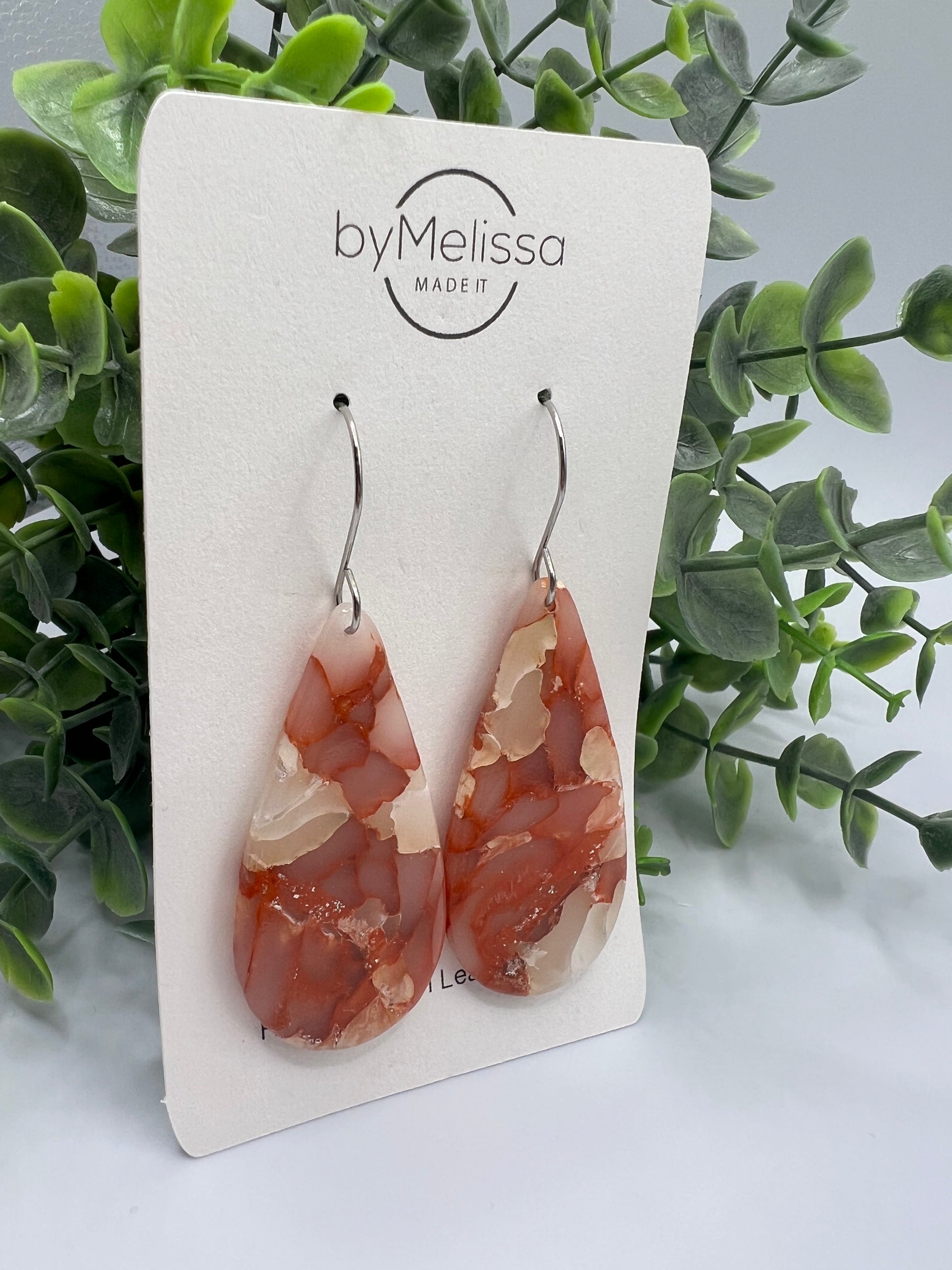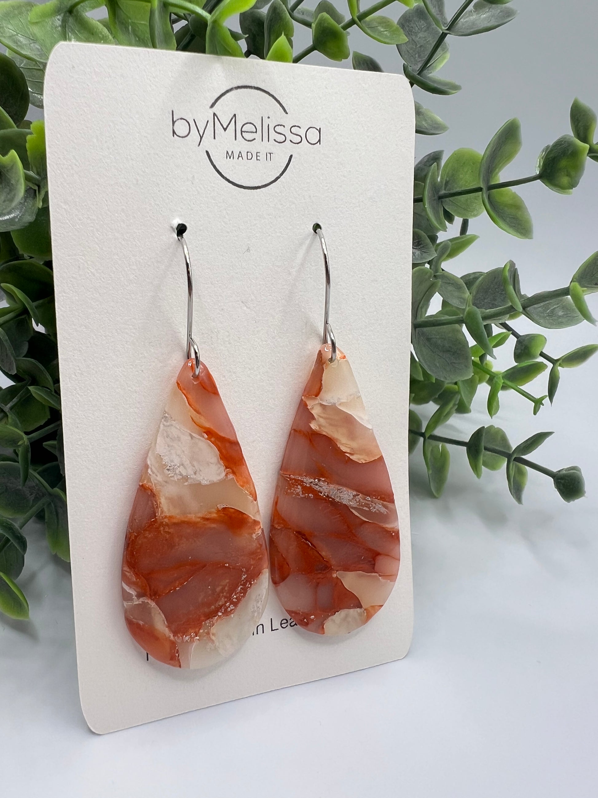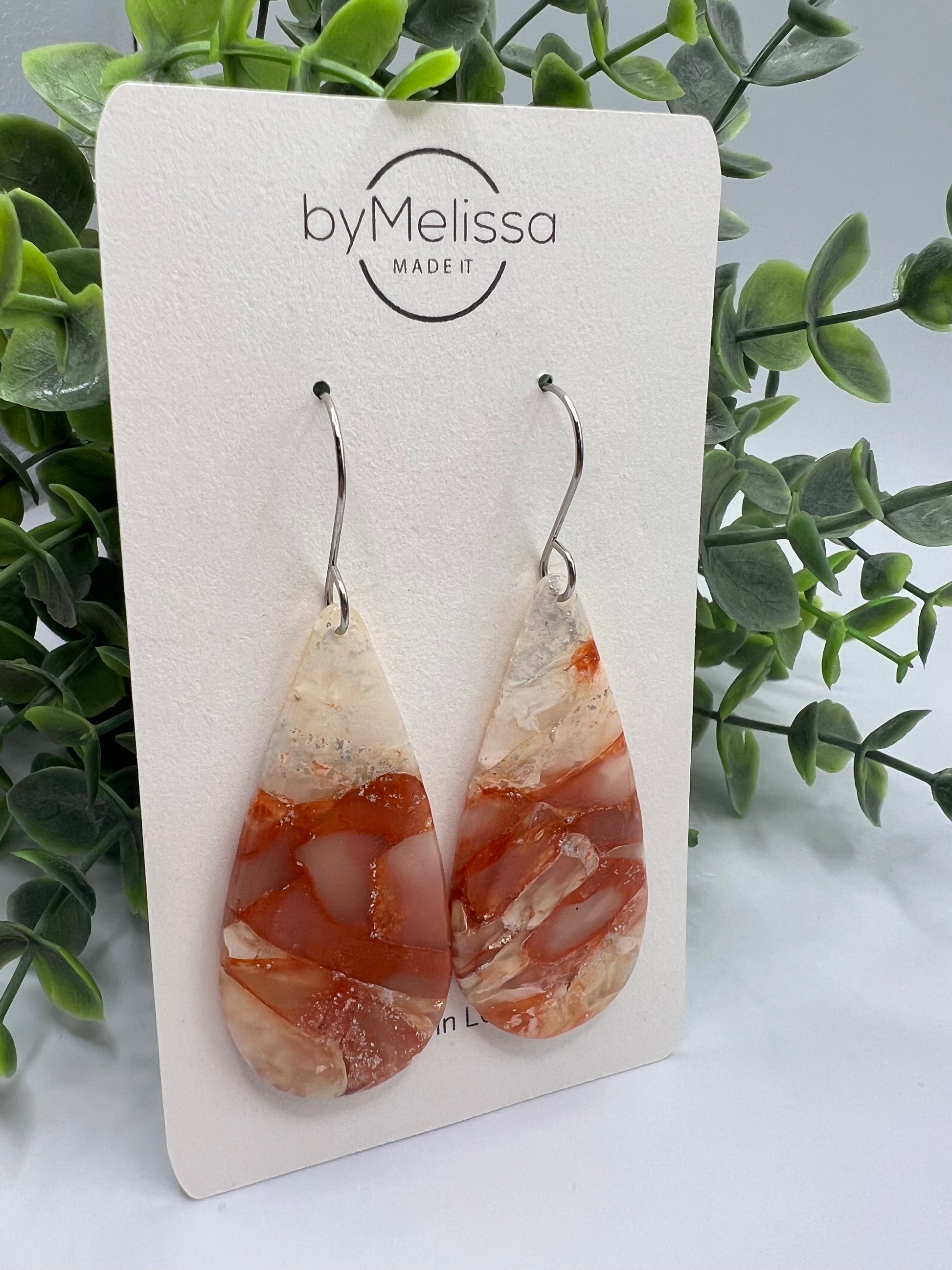 Orange and White Large Teardrop Drop Earrings in Silver