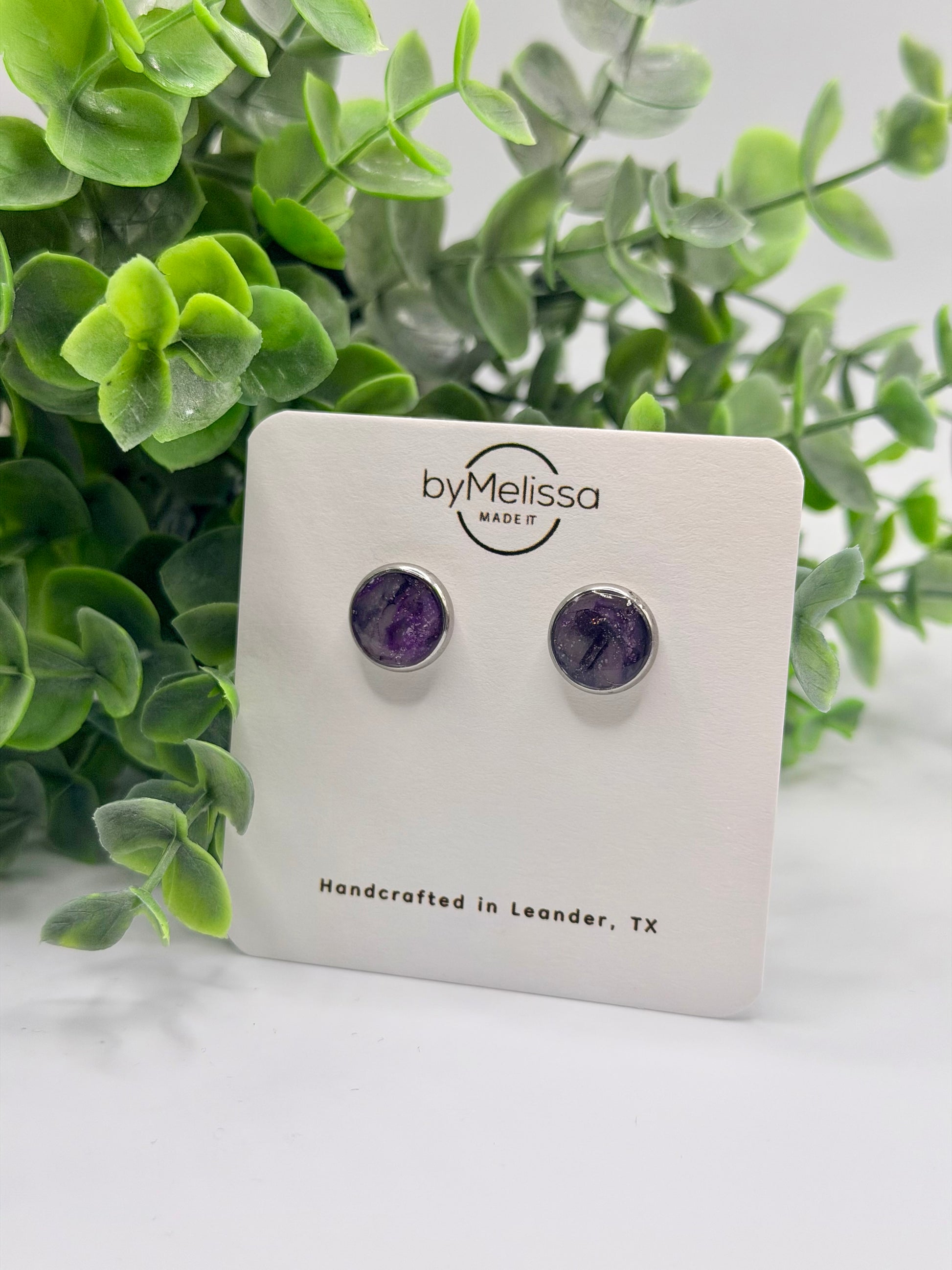 Purple and Black Circle Bezel Stud Earrings in Silver