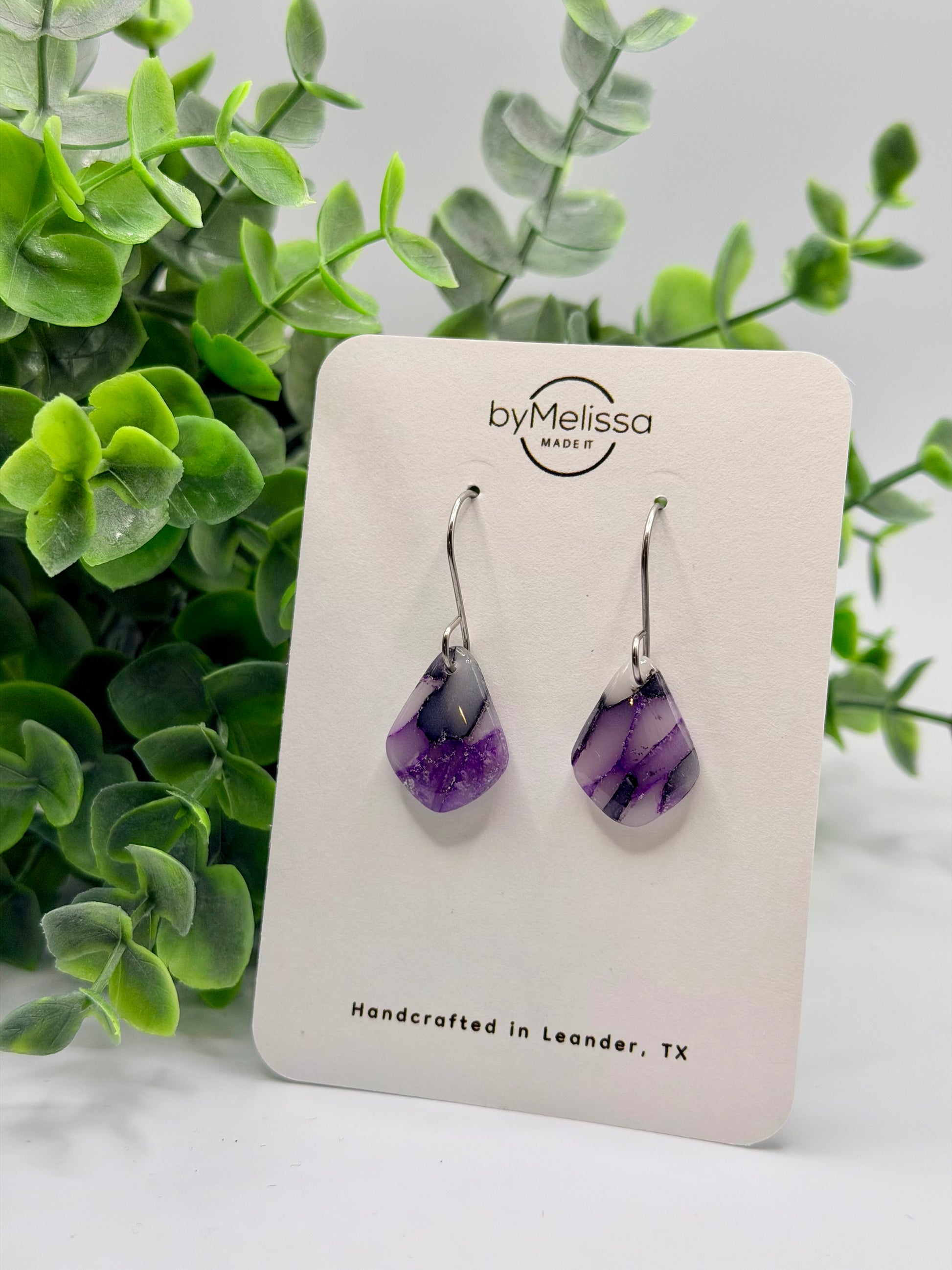 These purple and black petite kite earrings combine modern simplicity with bold, eye-catching color. Handcrafted from polymer clay, they’re lightweight and comfortable for all-day wear. Finished with hypoallergenic stainless steel hardware, they’re safe for sensitive ears and perfect for everyday outfits—or for subtly showing team spirit with a touch of style.