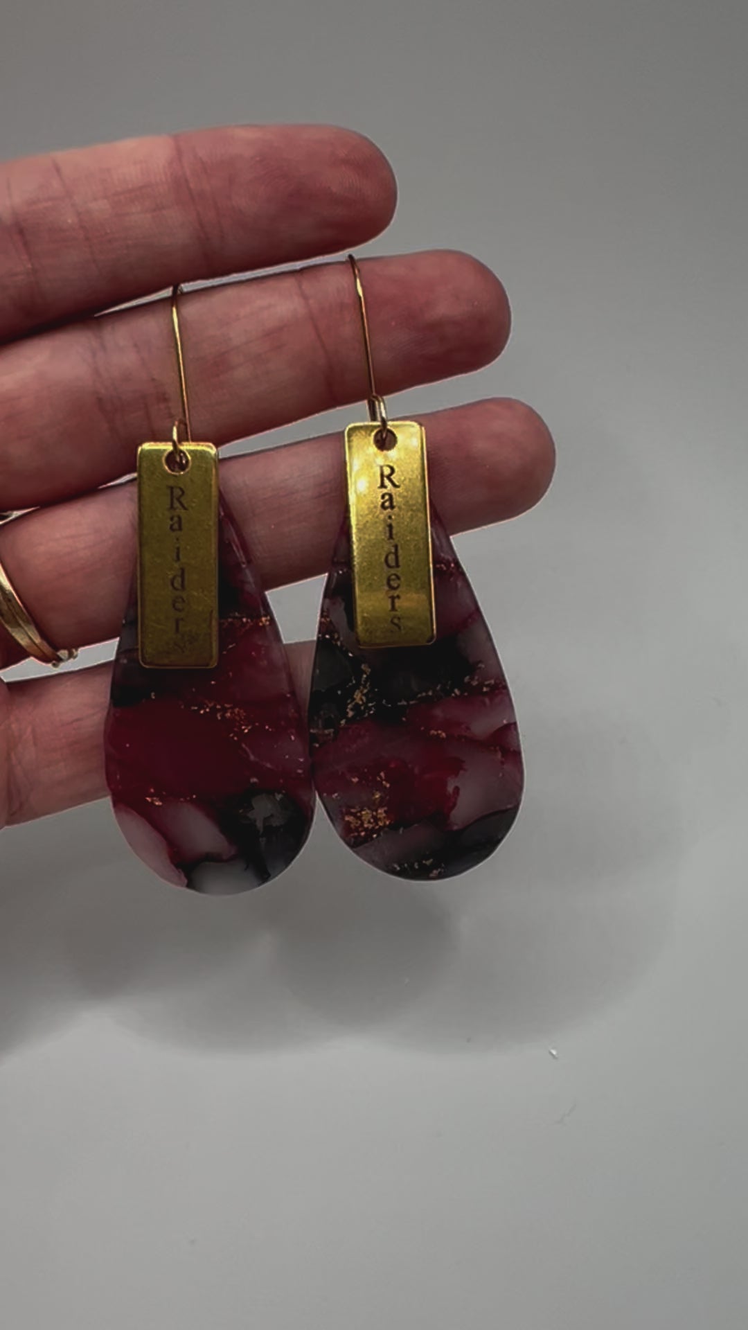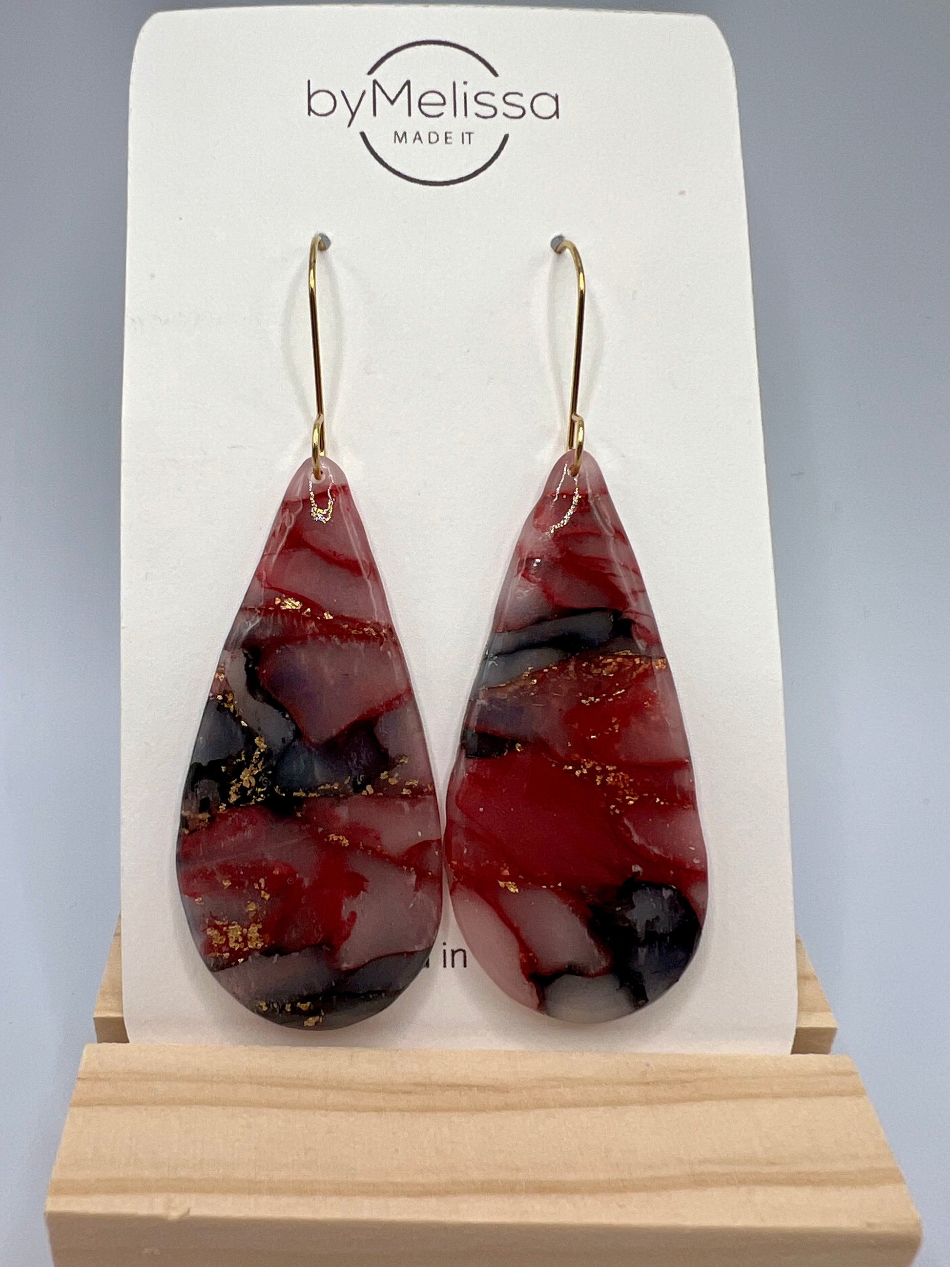 Unleash your inner rebel with our Maroon and Black Large Teardrop Drop Earrings in Gold! Made with a bold maroon and black marble design and delicate gold leaf accents, these teardrop shaped earrings will make a statement wherever you go. Handcrafted with polymer clay, they're lightweight and comfortable for all-day wear.
