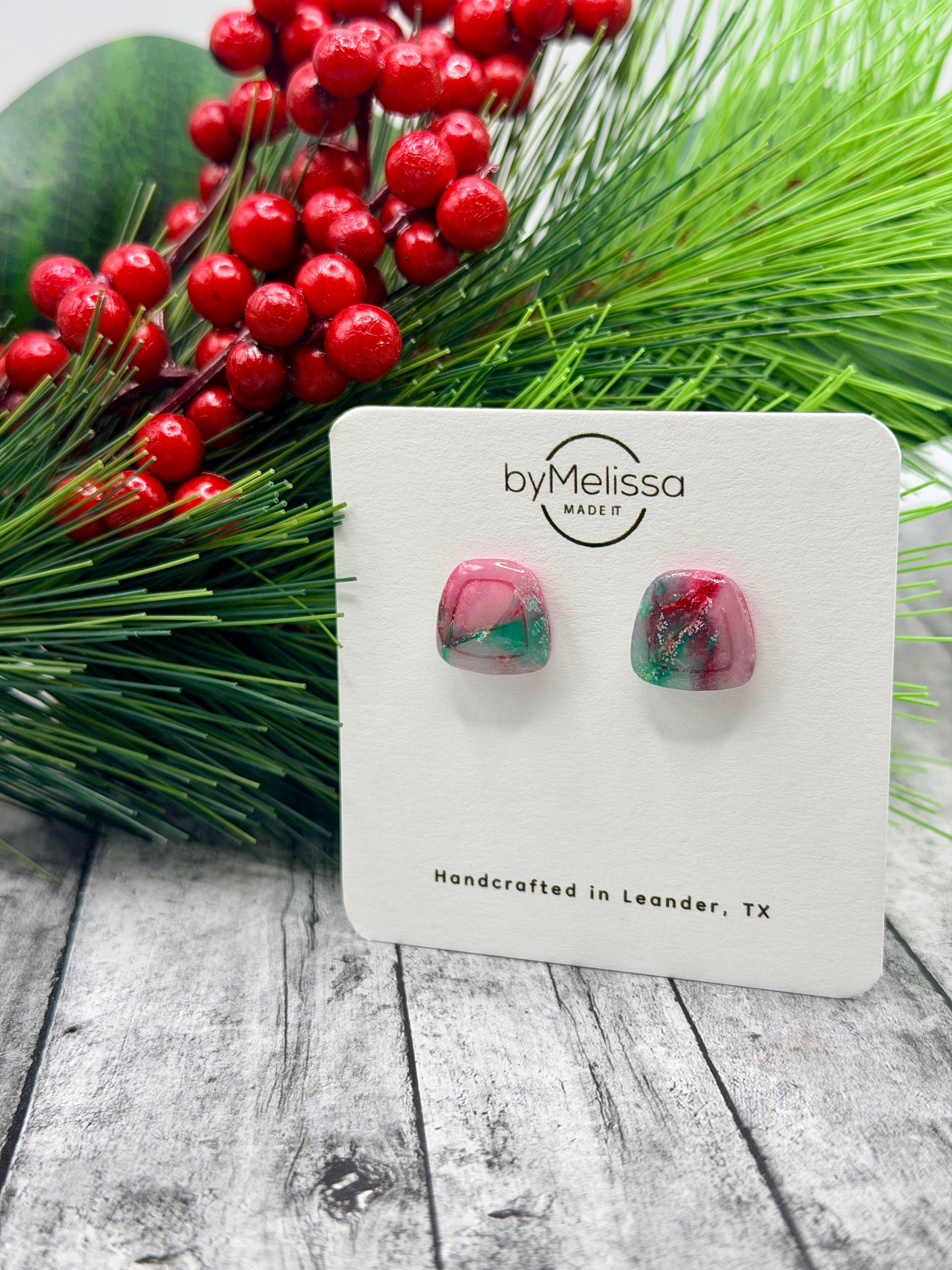 These handcrafted polymer clay stud earrings feature a festive red and green marbled design in a modern polygon shape. Created using a faux stone technique, each pair has its own unique swirl and texture. Set on hypoallergenic stainless steel posts that will not tarnish, these lightweight studs bring a subtle pop of holiday color perfect for both everyday wear and seasonal celebrations.