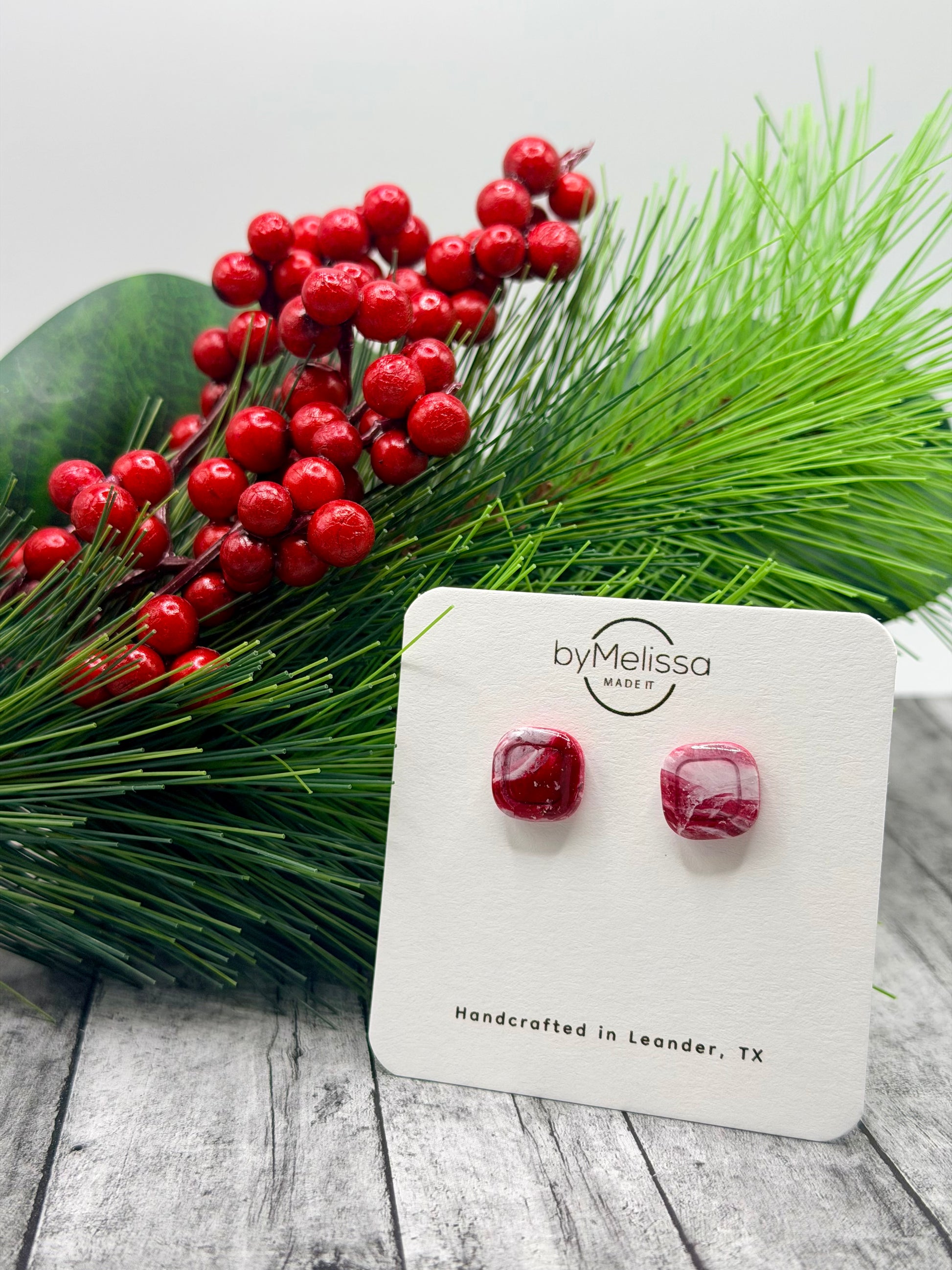 These handcrafted polymer clay stud earrings feature an embedded square design with a red and white marbled pattern created using a faux stone technique. Each pair is uniquely detailed, offering soft color movement and a polished finish. Set on hypoallergenic stainless steel posts that won’t tarnish, these lightweight studs are perfect for the holiday season, Valentine’s Day, or adding a subtle splash of color to your everyday style.