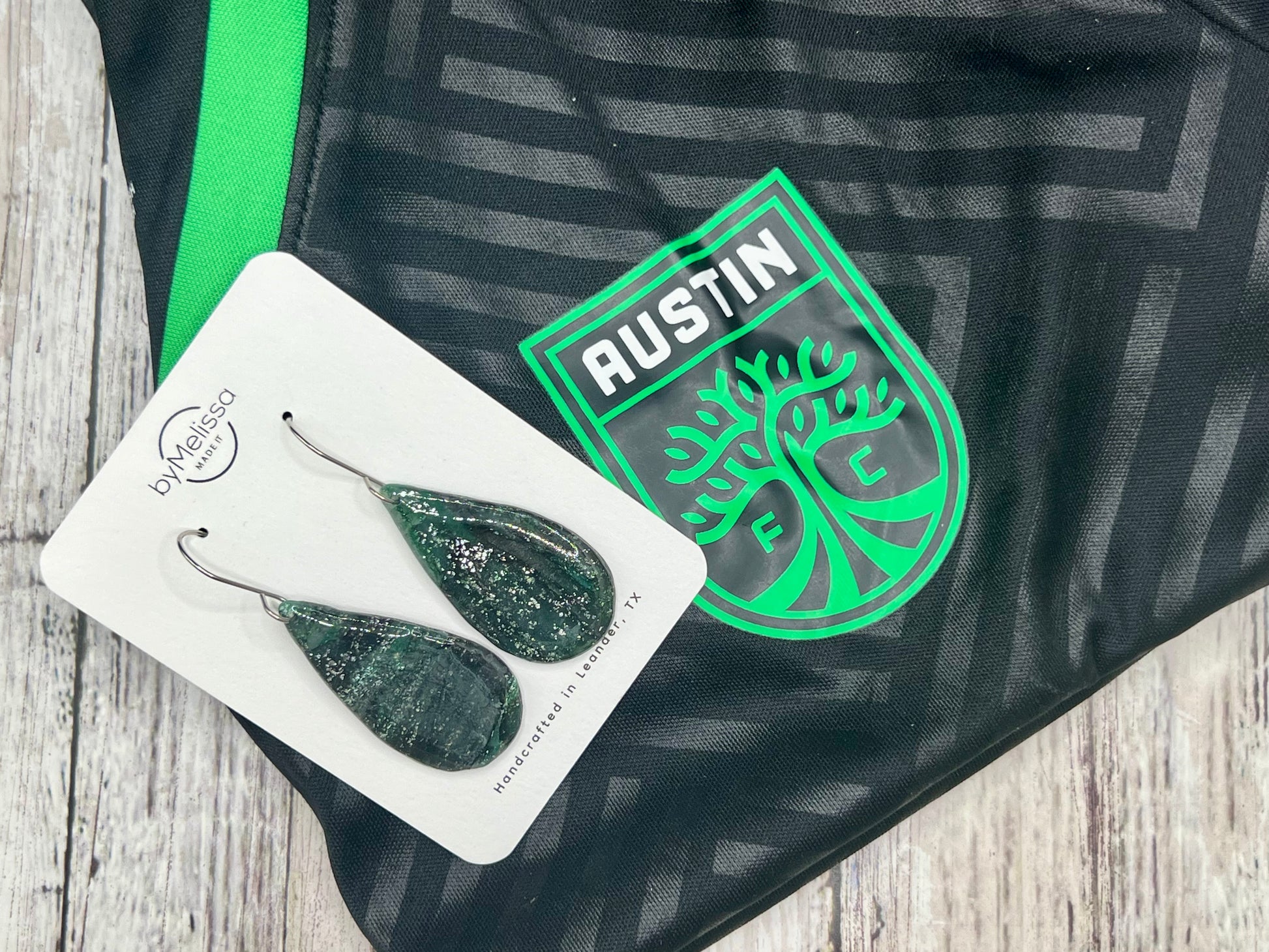 Elevate your game day look with our Forest Green and Black Small Teardrop Drop Earrings in Silver. Handcrafted with green and black polymer clay, these earrings add a touch of team spirit to any outfit. Show your support for your team with a subtle hint of silver.