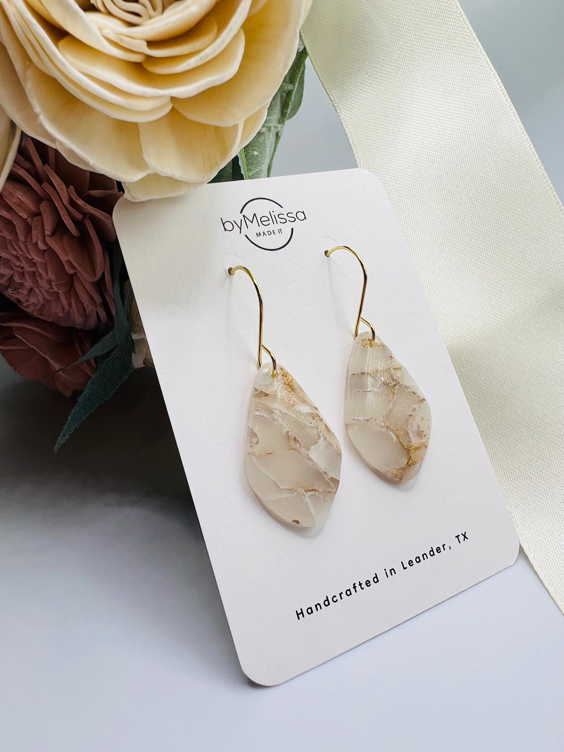 Add a touch of elegance with our White and Gold Small Kite Drop Earrings. These stunning earrings feature a pearl white and gold marbled design made of polymer clay. Perfect for weddings or fancy parties, add a cubic zirconia charm for an extra touch of sparkle. Elevate your style and turn heads with these one-of-a-kind earrings!
