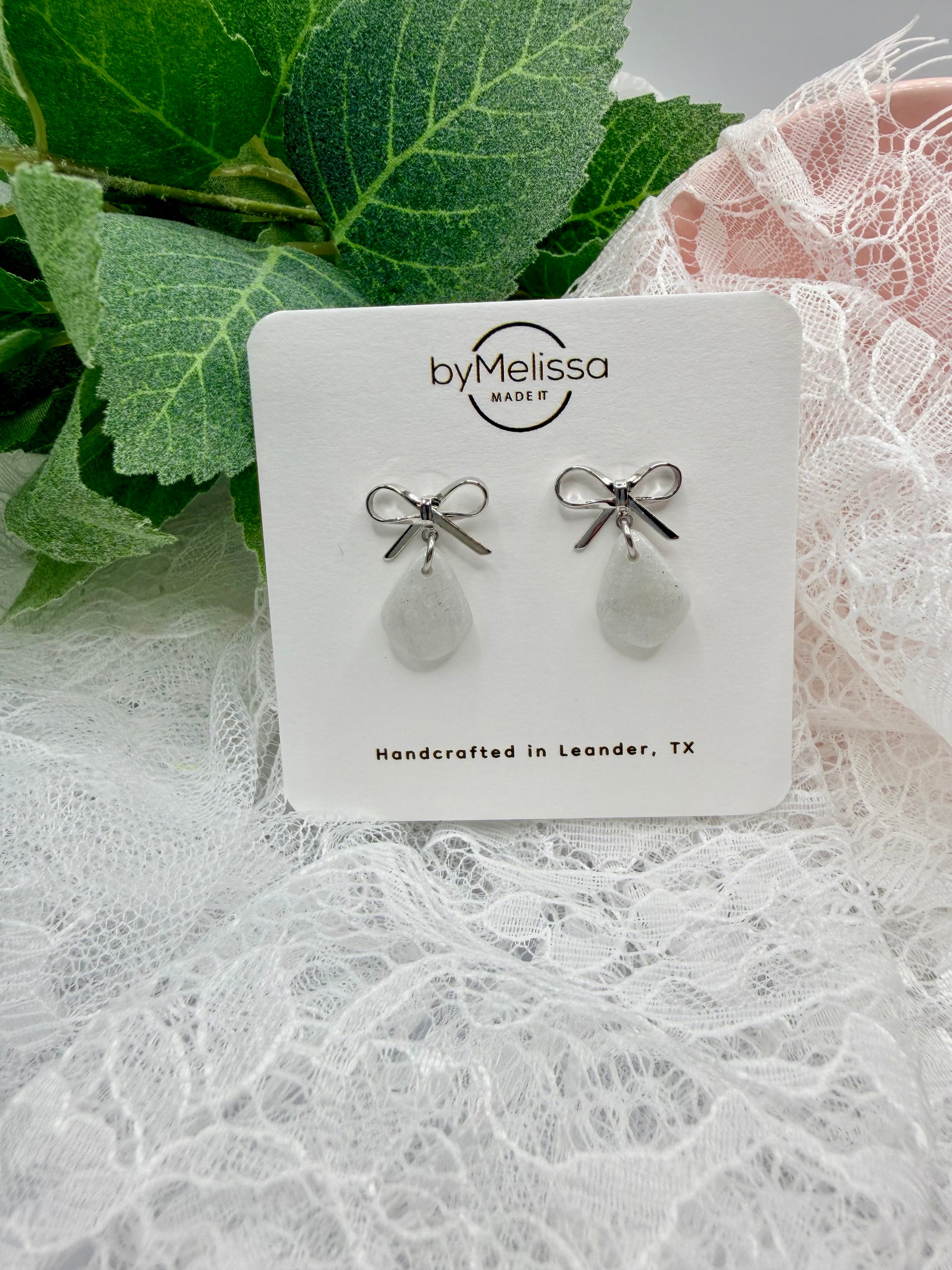 These white and silver mini kite earrings are paired with delicate bowknots for a charming, feminine look. Handcrafted from polymer clay, they’re lightweight and comfortable for all-day wear. Finished with hypoallergenic stainless steel hardware, they’re safe for sensitive ears and add a playful touch of elegance to any outfit.