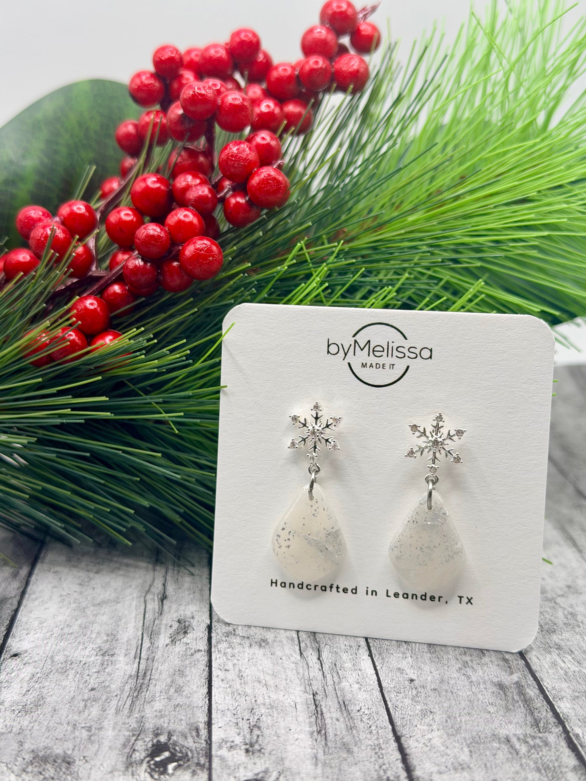 Handcrafted from polymer clay, these petite kite earrings feature a white and silver marbled design with a smooth, frosted finish. Paired with delicate silver snowflake studs, they add a subtle touch of winter charm and shimmer. Each pair is uniquely patterned using a faux stone technique for a one-of-a-kind look. Made with hypoallergenic stainless steel posts that won’t tarnish, these lightweight earrings are perfect for holiday outfits or everyday winter wear.