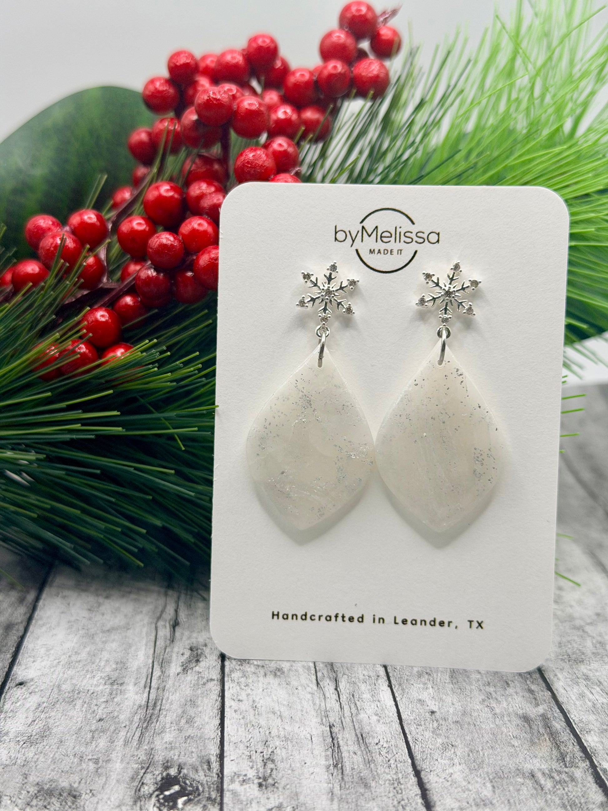 These handcrafted polymer clay earrings feature a wide leaf shape with a white and silver marbled design that captures a frosted, wintery feel. Paired with silver snowflake studs, they add just the right touch of seasonal sparkle. Each pair is uniquely made using a faux stone technique, giving them beautiful texture and shine. Finished with hypoallergenic stainless steel posts that won’t tarnish, these lightweight earrings are perfect for festive occasions or everyday winter style.